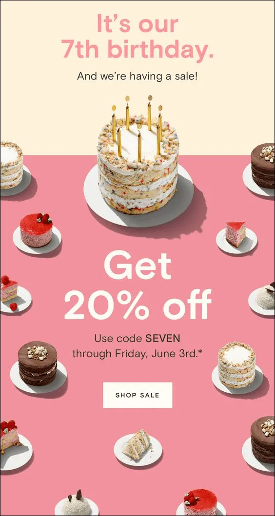 This anniversary email turns a brand milestone into a shared celebration, unlike the regular sales push. The visual language leads with emotion first; it could be a birthday, a cake, candles, before introducing the discount, which frames the offer as a gift instead of a promotion. The 20% incentive feels earned through the story of longevity rather than triggered by urgency alone.