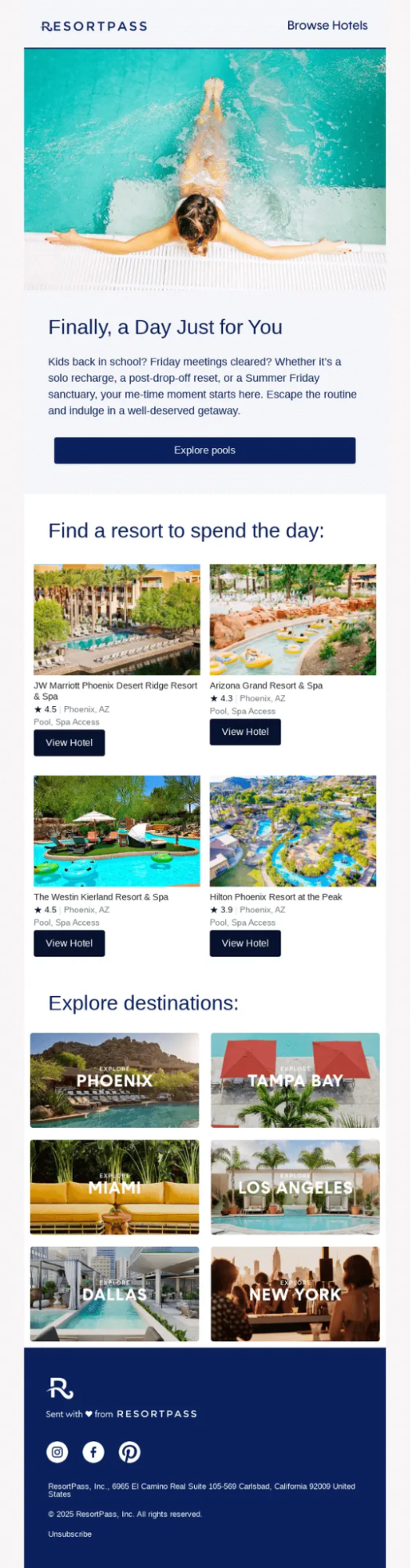 This promotional email encourages subscribers to book a relaxing day pass by tapping into the need for personal downtime (who doesn’t want that). It’s designed to inspire a getaway mindset and convert browsing into bookings through emotional appeal and curated resort options.