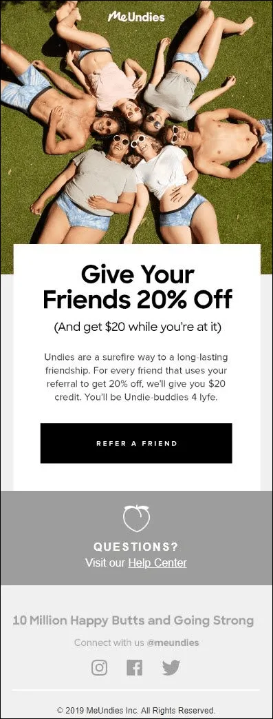 This is a referral promotion, and its goal is to turn existing customers into acquisition drivers by rewarding both the advocate and the referred friend. Brands send emails like this to scale growth through word-of-mouth, lower customer-acquisition cost, and build loyalty through shared incentives.