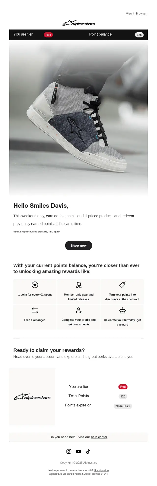 - It keeps the message friendly and supportive, inviting customers to claim rewards rather than pushing a sale. Tone matters, especially in loyalty communication.