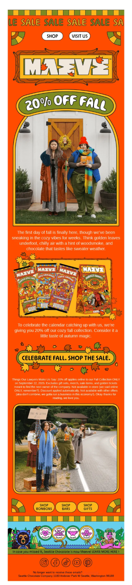 This is a seasonal promotion email positioned around the first day of fall, designed to drive traffic and revenue through a limited-time 20% discount tied to a timely cultural moment. These emails boost engagement during predictable demand spikes and are good to send to people who have abandoned their carts. So, segment your audience accordingly before sending these emails.