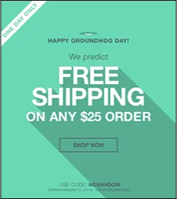 This promotional email has used a novelty holiday to introduce a limited-time offer, using Groundhog Day as a fun seasonal excuse to drive quick conversions. Brands send emails like this to activate urgency, increase short-term revenue, and re-engage passive subscribers through a low-resistance incentive such as free shipping.