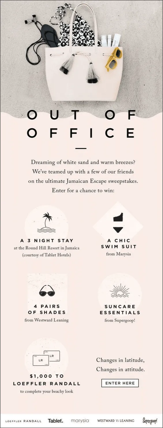 This campaign takes a completely different approach from Loeffler Randall’s previous abandoned cart mail. That email relied on subtle re-engagement and product resurfacing. Instead of nudging a shopper back to a previously viewed item, this promotional email creates an aspirational escape designed to spark excitement and participation. The headline “Out of Office” shifts emotional state immediately, inviting the reader into a dream-worthy travel scenario before presenting any promotional structure. The stacked prize lineup positions the sweepstakes as a high-value experience rather than a standard offer.