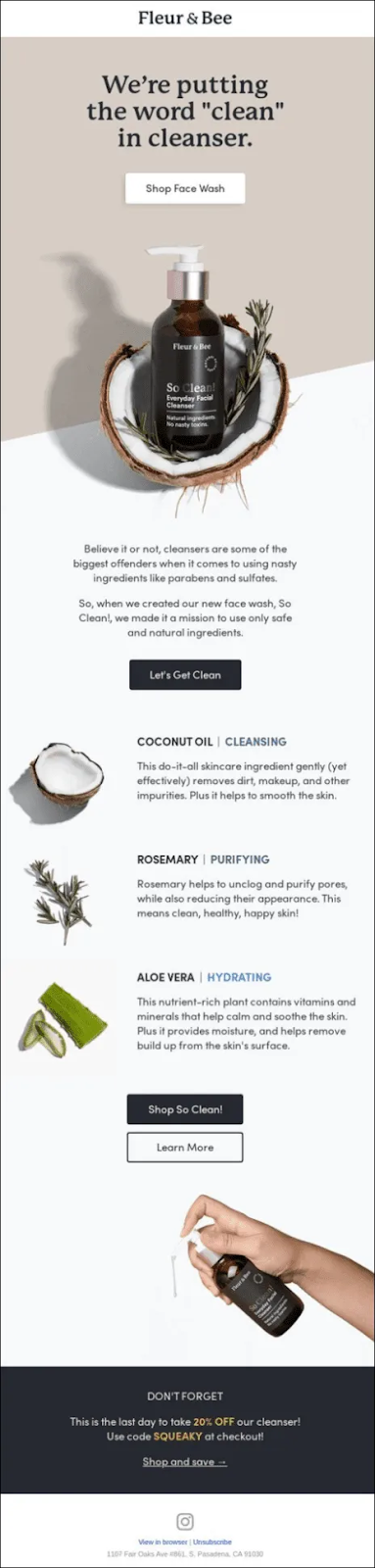 Fleur & Bee positions this campaign around a single, high-intent product and anchors the narrative in ingredient transparency and skin safety. The headline immediately reframes a common skincare concern, i.e., harsh cleansers, into a clear product promise, while the visual treatment keeps the focus tightly on the bottle, the formula, and the natural components that support the claim.