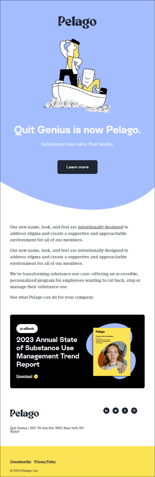 This is a rebrand announcement email created to communicate a name and identity change while reinforcing mission alignment and continuity of service. Brands send emails like this to maintain trust and prevent any confusion. It also reintroduces their value proposition under a refreshed positioning.
