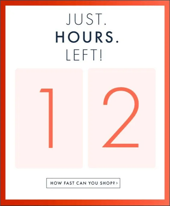 - It uses time pressure as the central motivator, which shifts the shopper’s mindset from browsing to deciding.
