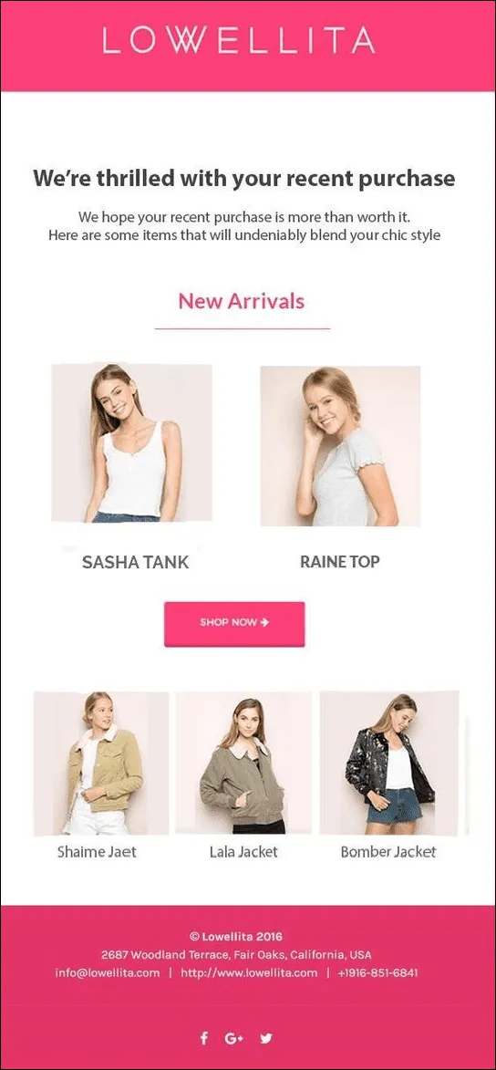 Lowellita capitalizes on recent purchase momentum by positioning product discovery as a natural next step rather than a cold upsell email. The opening line acknowledges the transaction first, which frames the email as service-driven before it becomes promotional.