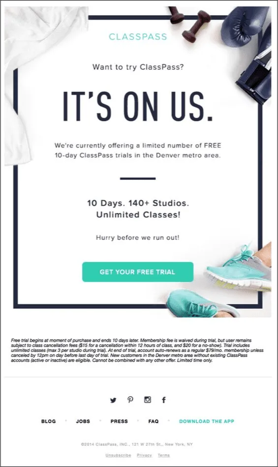 - It emphasizes a high-value offer with quantified benefits, which strengthens perceived worth. Access to 10 days, 140+ studios, and unlimited classes signals abundance and makes the trial feel worth it.