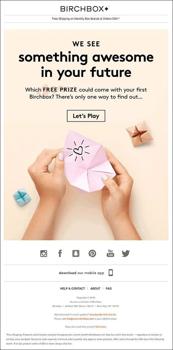 Birchbox frames the promotion as an experience rather than just a discount. It is inviting the subscriber to “play” for a free prize tied to their first box. The messaging centers on curiosity and future reward instead of price, which positions the brand as discovery-led rather than deal-driven. You must also add a subject line (to add curiosity), so atleast your email is opened. The interactive fortune-teller visual reinforces the idea of surprise, which aligns directly with the core value proposition of the subscription itself.
