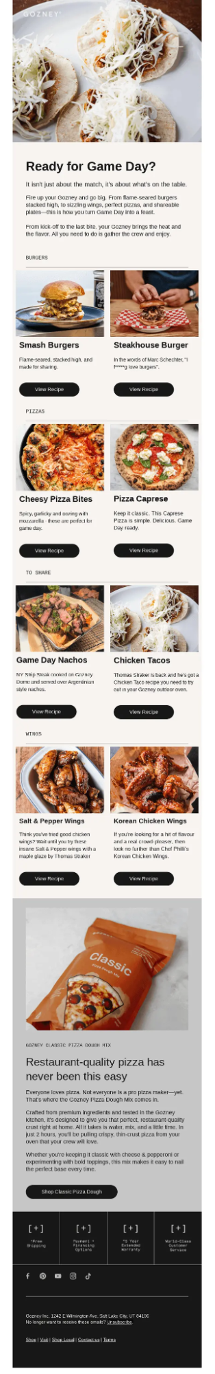 This promotional email builds excitement around game day and positions Gozney products as the centerpiece for hosting. Instead of pushing discounts, it sells the entire experience, turning recipes, food inspiration, and community moments into the reason to buy.
