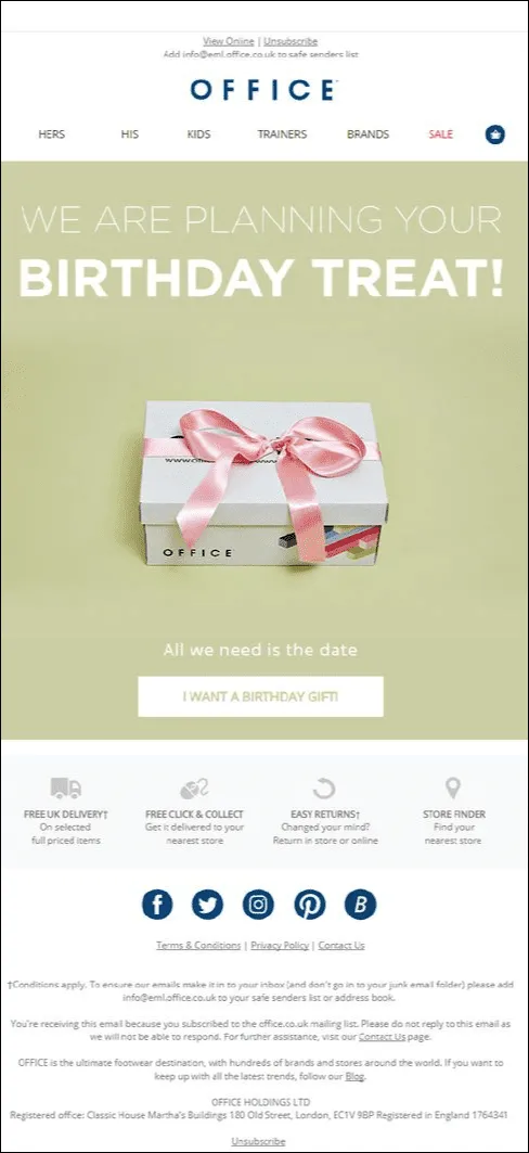The previous email is also a birthday email, but the brand’s birthday. This one, on the other hand, frames the request for a birth date as a personalized gift rather than a marketing preference update. The promise of a “birthday treat” positions the brand as proactive and thoughtful, not transactional. The visual of a wrapped gift reinforces the emotional cue before any commercial intent is introduced.