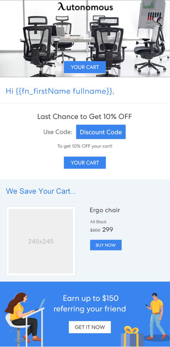 The abandoned cart program for a client Autonomous didn’t perform well. They implemented a standard three message cart program. Email one going out one hour after the cart abandonment, email two going out 24 hours and email three going after 48 hours. The 10% discount offer was provided in the second message and wasn’t repeated in the third message.
