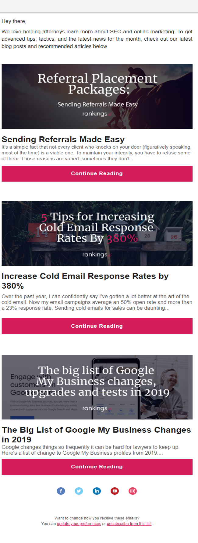 Each Rankings.io newsletter shares three pieces of content that help subscribers better understand SEO and how to use it to grow their practice.